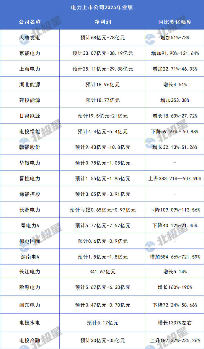 北极星电力网获悉,近日,20家电力上市公司陆续发布2025年度业绩预告,仅有1家企业预计亏损,其余全部实现盈利;在公布业绩的20家电力上市公司中,16家2025年度净利润同比增长,4家同比下滑。