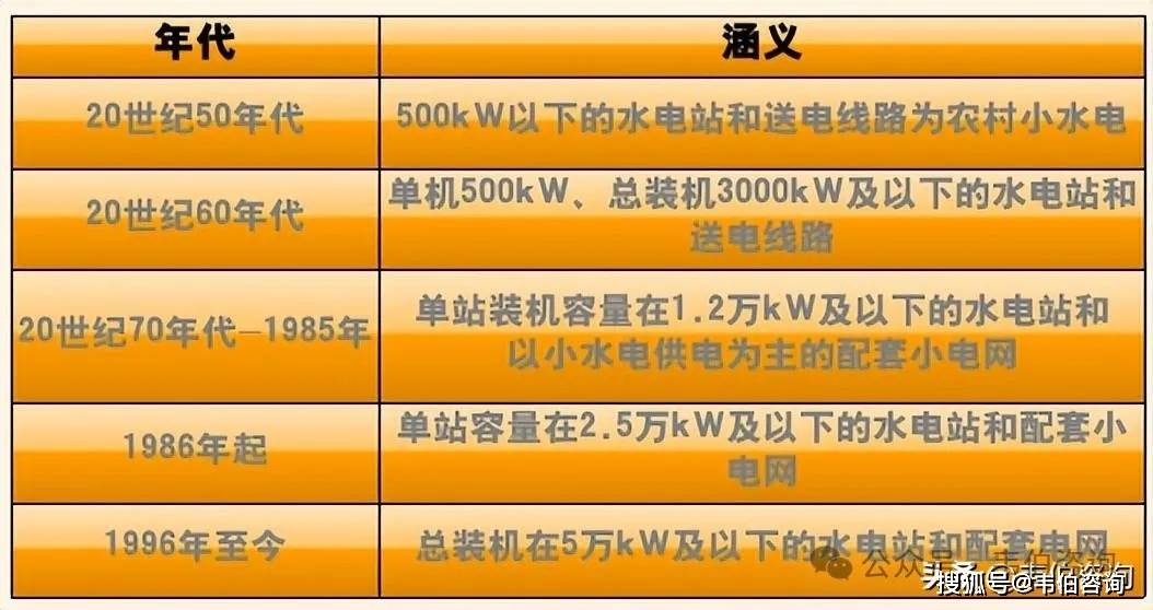自建国以来,中国对小水电的定义有过5次变动,其涵义也不断丰富。20世纪90年代及以后定义单站装机容量5万千瓦及以下为小水电。