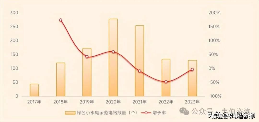 图表6:2017-2023年中国绿色小水电示范电站数量及增长率(个,%)